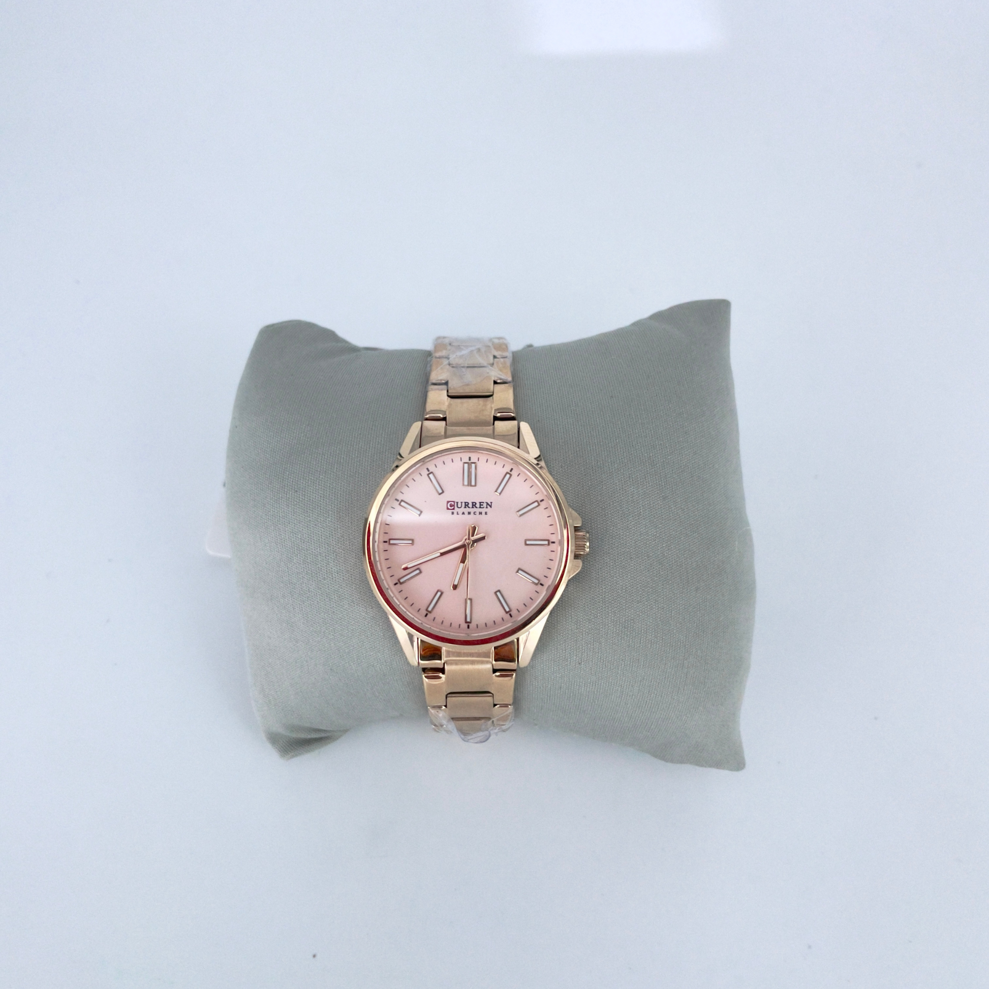 - Boîtier acier inoxydable avec lunette plaquée or rose.
