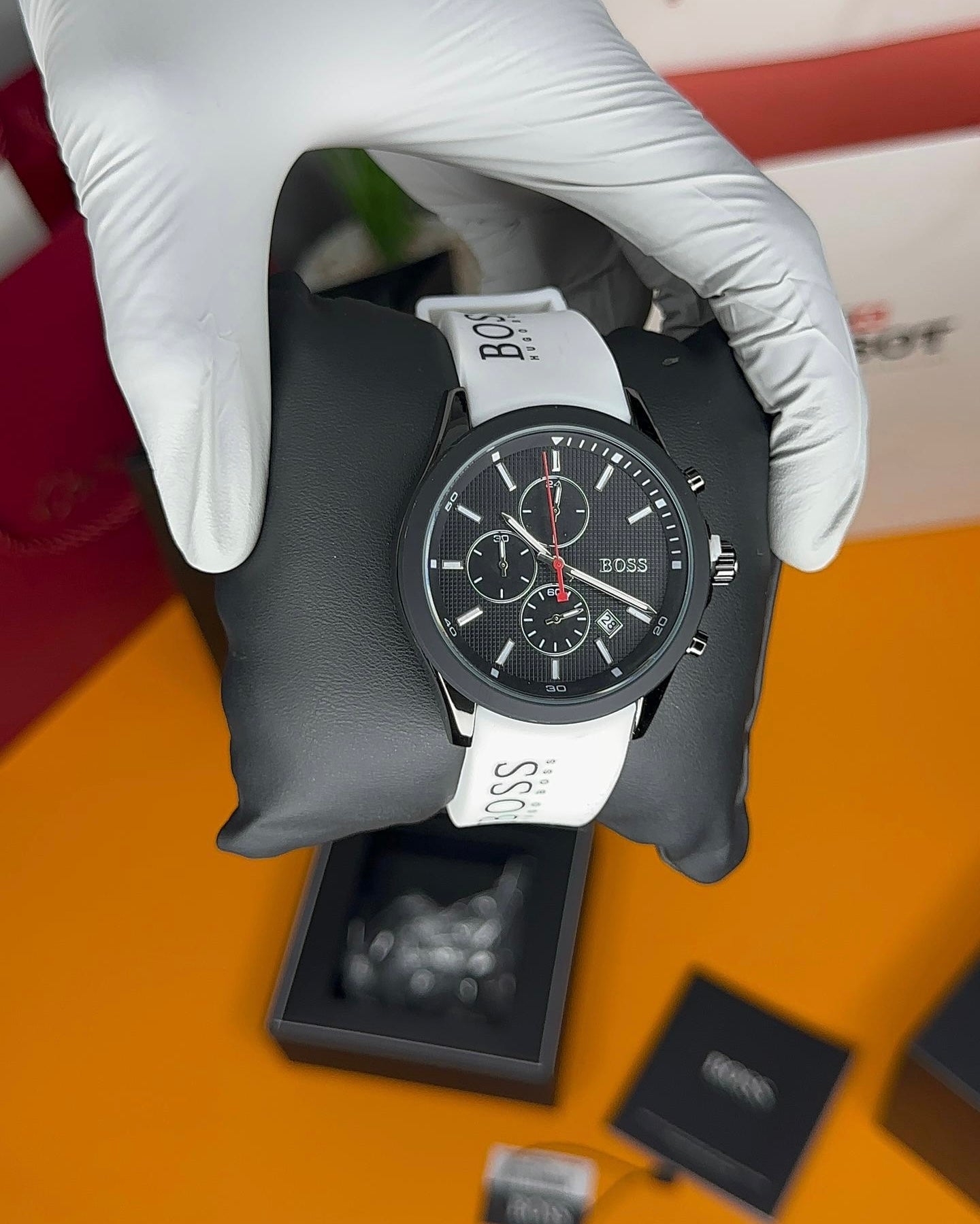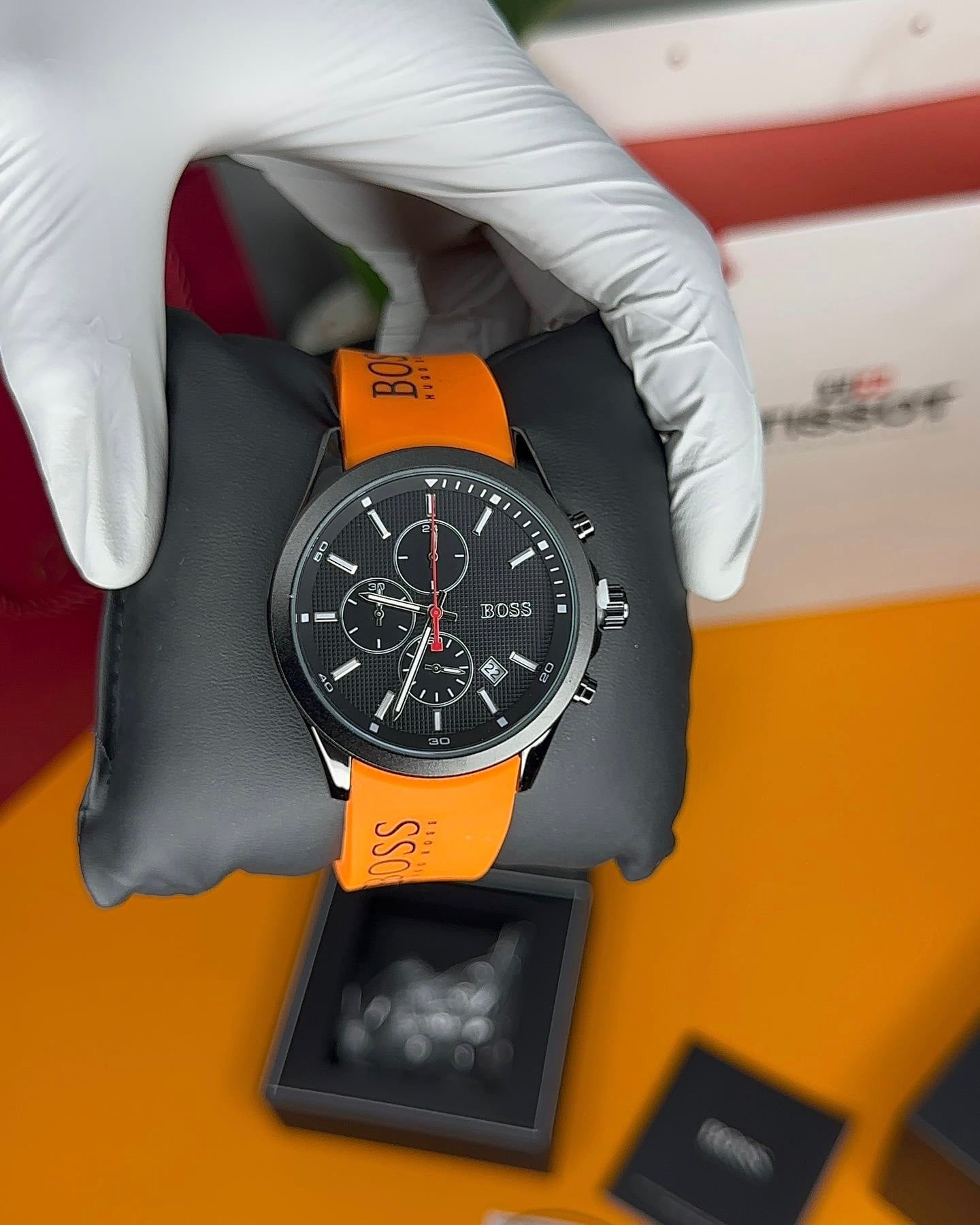 - Bracelet : Silicone noir avec logo BOSS gravé